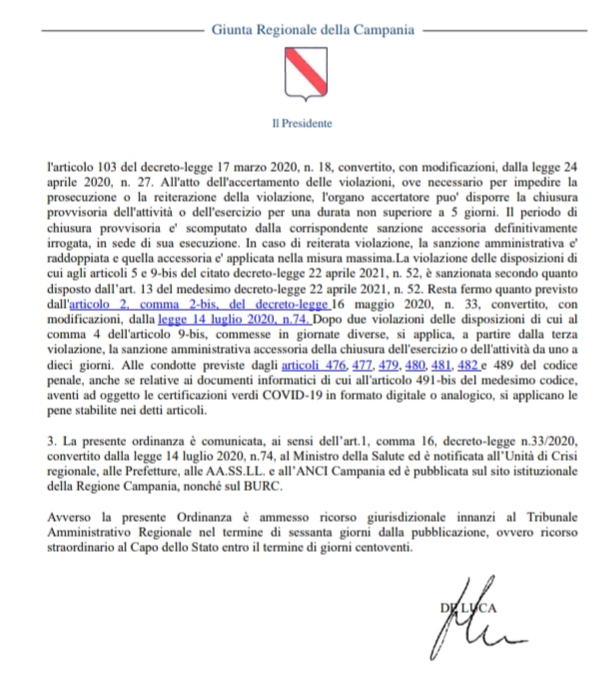 3. La presente ordinanza - si legge - è comunicata, ai sensi dell’art.1, comma 16, decreto-legge n.33/2020, convertito dalla legge 14 luglio 2020, n.74, al Ministro della Salute ed è notificata all’Unità di Crisi regionale, alle Prefetture, alle AA.SS.LL. e all’ANCI Campania ed è pubblicata sul sito istituzionale