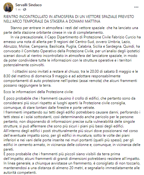 Questo il post pubblicato dal Sindaco di Cava de' Tirreni Vincenzo Servalli sulla sua pagina Facebook: "Rientro incontrollato in atmosfera di un vettore spaziale previsto nell'arco temporale da stasera a domattina. Stanno per entrare in atmosfera i resti del vettore spaziale che ha lanciato una parte della stazione orbitante cinese - si legge nel post - in via di completamento. In via precauzionale, il Capo Dipartimento di Protezione Civile Fabrizio Curcio ha emesso una nota di allerta per 9 regioni del Centro-Sud, ovvero Umbria, Lazio, Abruzzo, Molise, Campania, Basilicata, Puglia, Calabria, Sicilia e Sardegna. Quindi, - si legge ancora nel post - ha convocato il Comitato Operativo della Protezione Civile, per un'analisi degli ipotetici scenari dovuti al rientro incontrollato in atmosfera del lanciatore spaziale, in modo da poter condividere tutte le informazioni con le strutture operative e i territori potenzialmente coinvolti. I cittadini sono invitati a restare al chiuso, tra le 20:30 di sabato 8 maggio e le 8:30 del mattino di domenica 9 maggio - prosegue il post - e ad adottare responsabilmente comportamenti di auto protezione nell'ipotesi (assai remota) che alcuni frammenti possano raggiungere la terra. Ecco le informazioni della Protezione civile: È poco probabile che i frammenti causino il crollo di edifici - si legge ancora - che pertanto sono da considerarsi più sicuri rispetto ai luoghi aperti: la Protezione civile consiglia, comunque, di stare lontani dalle finestre e porte vetrate. I frammenti impattando sui tetti degli edifici potrebbero causare danni, perforando i tetti stessi e i solai sottostanti, così determinando anche pericolo per le persone: pertanto - si legge ancora nel post - non disponendo di informazioni precise sulla vulnerabilità delle singole strutture, si può affermare che sono più sicuri i piani più bassi degli edifici. All'interno degli edifici i posti strutturalmente più sicuri dove posizionarsi nel corso dell'eventuale impatto sono, per gli edifici in muratura, sotto le volte dei piani inferiori e nei vani delle porte inserite nei muri portanti (quelli più spessi), per gli edifici in cemento armato - si legge ancora - in vicinanza delle colonne e, comunque, in vicinanza delle pareti. È poco probabile - prosegue il post - che i frammenti più piccoli siano visibili da terra prima dell'impatto; alcuni frammenti di grandi dimensioni potrebbero resistere all'impatto. In linea generale, a chiunque avvistasse un frammento, è consigliato di non toccarlo, mantenendosi a una distanza di almeno 20 metri, e segnalarlo - conclude il post - immediatamente alle autorità competenti".