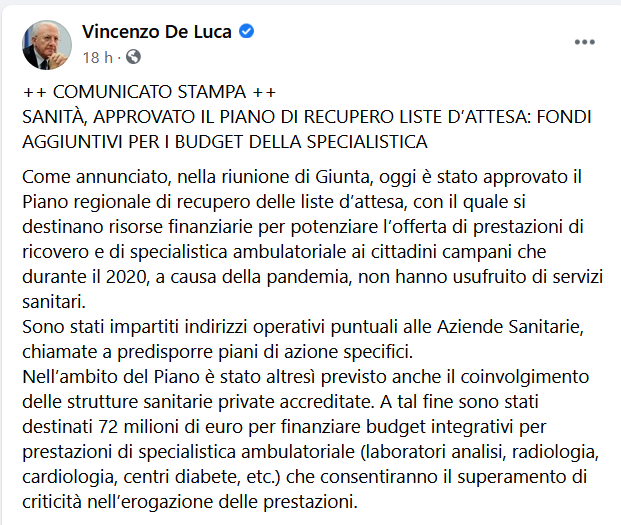 Questo il post pubblicato dalla pagina Facebook del Presidente della Regione Campania, Vincenzo De Luca: "Come annunciato, nella riunione di Giunta, oggi è stato approvato il Piano regionale di recupero delle liste d’attesa, con il quale si destinano risorse finanziarie per potenziare l’offerta di prestazioni di ricovero e di specialistica ambulatoriale ai cittadini campani che durante il 2020, a causa della pandemia, non hanno usufruito di servizi sanitari. Sono stati impartiti - si legge - indirizzi operativi puntuali alle Aziende Sanitarie, chiamate a predisporre piani di azione specifici. Nell’ambito del Piano è stato altresì previsto anche il coinvolgimento delle strutture sanitarie private accreditate. A tal fine - conclude - sono stati destinati 72 milioni di euro per finanziare budget integrativi per prestazioni di specialistica ambulatoriale (laboratori analisi, radiologia, cardiologia, centri diabete, etc.) che consentiranno il superamento di criticità nell’erogazione delle prestazioni".