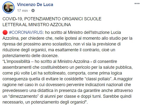 Questo quanto apprendiamo dalla pagina facebook del Pres. De Luca: