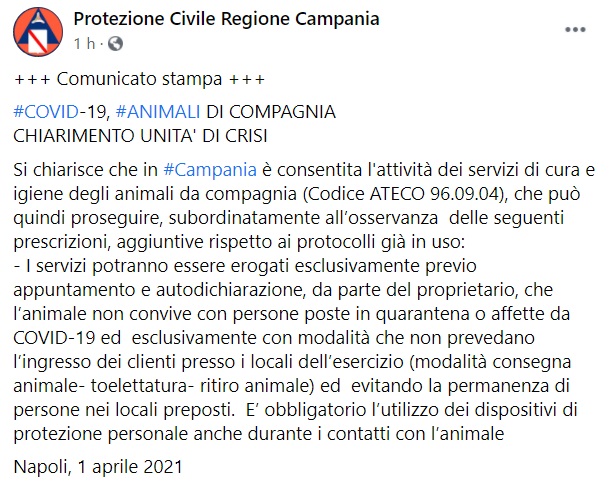 Questo quanto pubblicato sulla pagina fb della Prot. Civile Campania: "Comunicato stampa COVID-19, ANIMALI DI COMPAGNIA CHIARIMENTO UNITA' DI CRISI Si chiarisce che in Campania è consentita l'attività dei servizi di cura e igiene degli animali da compagnia (Codice ATECO 96.09.04) - si legge nella nota -, che può quindi proseguire, subordinatamente all’osservanza delle seguenti prescrizioni, aggiuntive rispetto ai protocolli già in uso: - I servizi potranno essere erogati esclusivamente previo appuntamento e autodichiarazione, da parte del proprietario, che l’animale - si legge nella nota - non convive con persone poste in quarantena o affette da COVID-19 ed esclusivamente con modalità che non prevedano l’ingresso dei clienti presso i locali dell’esercizio (modalità consegna animale - toelettatura - ritiro animale) ed evitando la permanenza di persone nei locali preposti. E’ obbligatorio l’utilizzo dei dispositivi di protezione personale - si legge nella nota - anche durante i contatti con l’animale. Napoli, 1 aprile 2021"