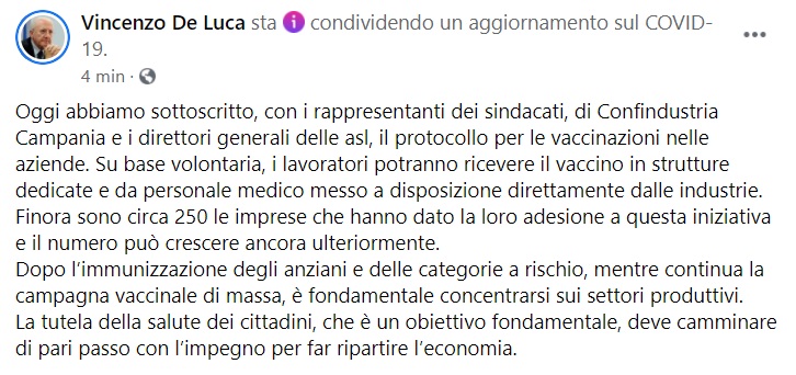 "Oggi abbiamo sottoscritto, con i rappresentanti dei sindacati, di Confindustria Campania e i direttori generali delle asl, il protocollo per le vaccinazioni nelle aziende. Su base volontaria, i lavoratori potranno ricevere il vaccino in strutture dedicate e da personale medico messo a disposizione direttamente dalle industrie. -Si legge nella nota- Finora sono circa 250 le imprese che hanno dato la loro adesione a questa iniziativa e il numero può crescere ancora ulteriormente. -Si legge nella nota- Dopo l’immunizzazione degli anziani e delle categorie a rischio, mentre continua la campagna vaccinale di massa, è fondamentale concentrarsi sui settori produttivi. La tutela della salute dei cittadini, che è un obiettivo fondamentale, deve camminare di pari passo con l’impegno per far ripartire l’economia."