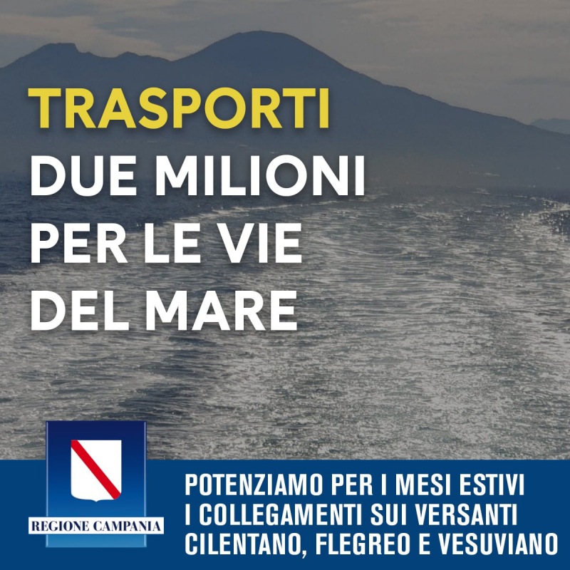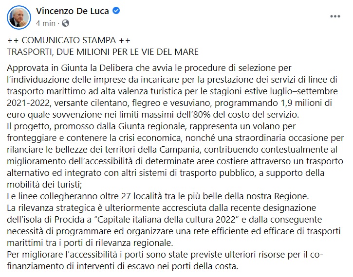 "++ COMUNICATO STAMPA ++ TRASPORTI, DUE MILIONI PER LE VIE DEL MARE. Approvata in Giunta la Delibera che avvia le procedure di selezione per l’individuazione delle imprese da incaricare- si legge nella nota- per la prestazione dei servizi di linee di trasporto marittimo ad alta valenza turistica per le stagioni estive luglio–settembre 2021-2022, versante cilentano, flegreo e vesuviano, programmando 1,9 milioni di euro quale sovvenzione nei limiti massimi dell’80% del costo del servizio. Il progetto, promosso dalla Giunta regionale, rappresenta un volano per fronteggiare e contenere la crisi economica, nonché una straordinaria occasione per rilanciare le bellezze dei territori della Campania, contribuendo contestualmente al miglioramento dell’accessibilità di determinate aree costiere attraverso un trasporto alternativo ed integrato con altri sistemi di trasporto pubblico, a supporto della mobilità dei turisti; Le linee collegheranno oltre 27 località tra le più belle della nostra Regione. La rilevanza strategica è- si legge nella nota- ulteriormente accresciuta dalla recente designazione dell’isola di Procida a “Capitale italiana della cultura 2022” e dalla conseguente necessità di programmare ed organizzare una rete efficiente ed efficace di trasporti marittimi tra i porti di rilevanza regionale. Per migliorare l'accessibilità i porti sono state previste ulteriori risorse per il co-finanziamento di interventi di escavo nei porti della costa."