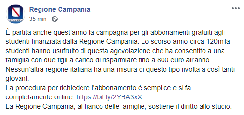 Questo il post pubblicato sulla pagina Facebook della Regione Campania: