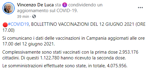 Questo il post pubblicato sulla sua pagina Facebook dal Presidente della Regione Campania Vincenzo De Luca: "Covid-19, BOLLETTINO VACCINAZIONI DEL 12 GIUGNO 2021 (ORE 17.00). Si comunicano i dati delle vaccinazioni in Campania - si legge nel post - aggiornati alle ore 17.00 del 12 giugno 2021. Complessivamente sono stati vaccinati con la prima dose 2.953.176 cittadini. Di questi 1.122.780 hanno ricevuto la seconda dose. Le somministrazioni effettuate - conclude il post - sono state, in totale, 4.075.956".