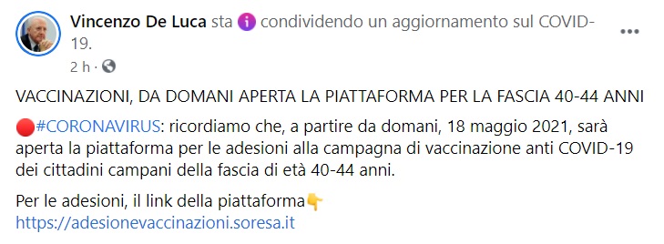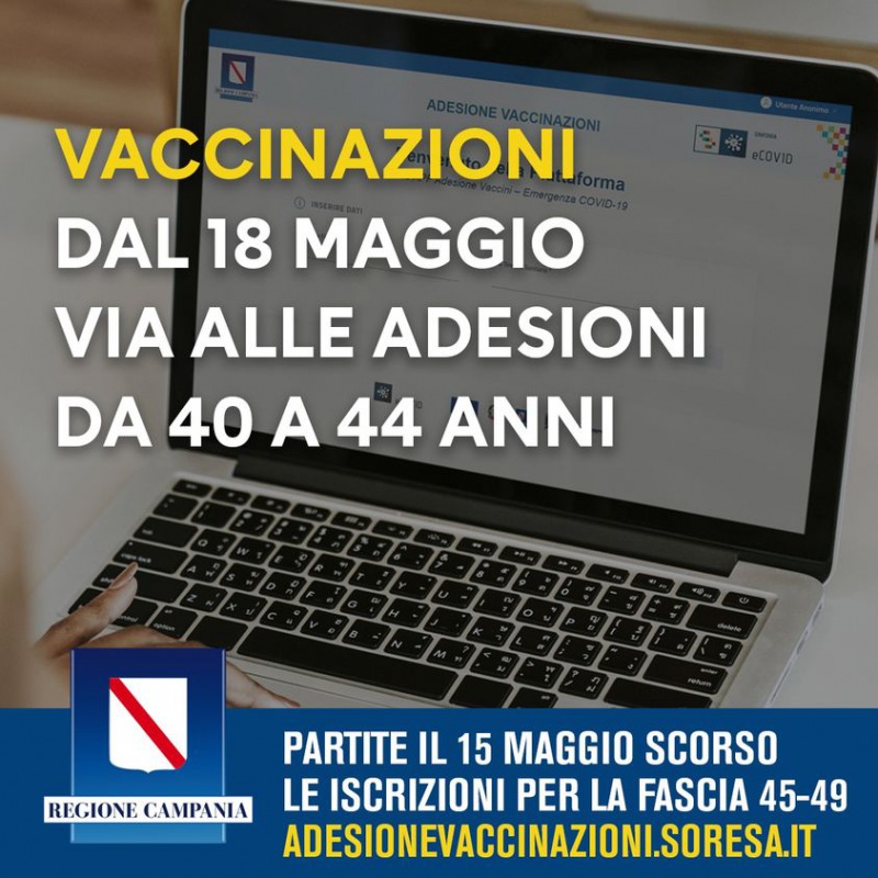 "#CORONAVIRUS: ricordiamo che, a partire da domani, 18 maggio 2021, sarà aperta la piattaforma per le adesioni alla campagna di vaccinazione anti COVID-19 dei cittadini campani della fascia di età 40-44 anni. Per le adesioni, il link della piattaforma https://adesionevaccinazioni.soresa.it"