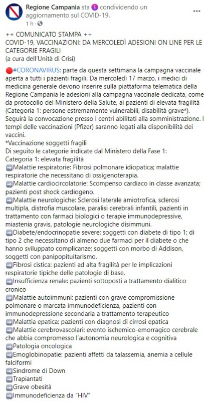 "#CORONAVIRUS: parte da questa settimana la campagna vaccinale aperta a tutti i pazienti fragili. Da mercoledì 17 marzo, i medici di medicina generale devono inserire sulla piattaforma telematica della Regione Campania le adesioni alla campagna vaccinale dedicata, come da protocollo del Ministero della Salute, ai pazienti di elevata fragilità (Categoria 1: persone estremamente vulnerabili, disabilità grave*). Seguirà la convocazione presso i centri abilitati alla somministrazione. I tempi delle vaccinazioni (Pfizer) saranno legati alla disponibilità dei vaccini. *Vaccinazione soggetti fragili Di seguito le categorie indicate dal Ministero della Fase 1: Categoria 1: elevata fragilità Malattie respiratorie: Fibrosi polmonare idiopatica; malattie respiratorie che necessitano di ossigenoterapia. Malattie cardiocircolatorie: Scompenso cardiaco in classe avanzata; pazienti post shock cardiogeno. Malattie neurologiche: Sclerosi laterale amiotrofica, sclerosi multipla, distrofia muscolare, paralisi cerebrali infantili, pazienti in trattamento con farmaci biologici o terapie immunodepressive, miastenia gravis, patologie neurologiche disimmuni. Diabete/endocrinopatie severe: soggetti con diabete di tipo 1; di tipo 2 che necessitano di almeno due farmaci per il diabete o che hanno sviluppato complicanze; soggetti con morbo di Addison, soggetti con panipopituitarismo. Fibrosi cistica: pazienti ad alta fragilità per le implicazioni respiratorie tipiche delle patologie di base. Insufficienza renale: pazienti sottoposti a trattamento dialitico cronico Malattie autoimmuni: pazienti con grave compromissione polmonare o marcata immunodeficienza, pazienti con immunodepressione secondaria a trattamento terapeutico Malattia epatica: pazienti con diagnosi di cirrosi epatica Malattie cerebrovascolari: evento ischemico-emorragico cerebrale che abbia compromesso l’autonomia neurologica e cognitiva Patologia oncologica Emoglobinopatie: pazienti affetti da talassemia, anemia a cellule falciformi Sindrome di Down Trapiantati Grave obesità Immunodeficienza da “HIV”"
