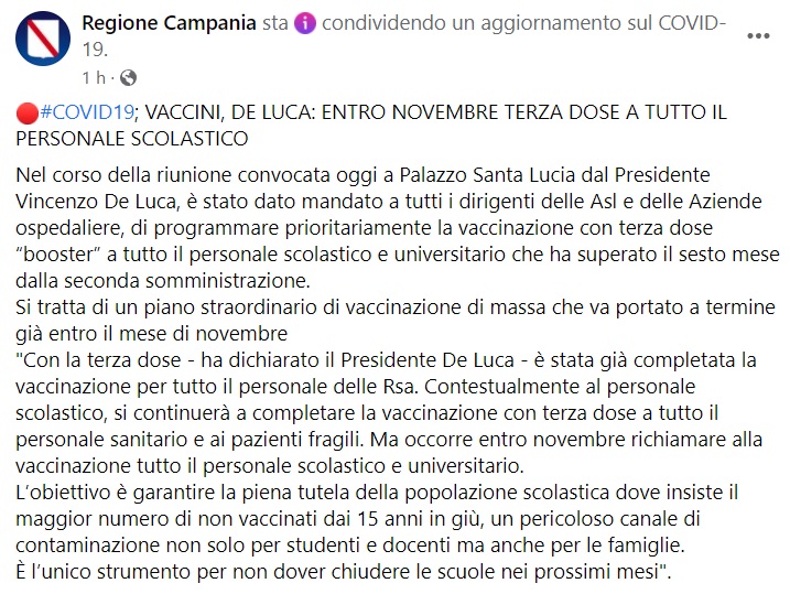 Questo quanto apprendiamo dalla pagina facebook della Regione Campania: