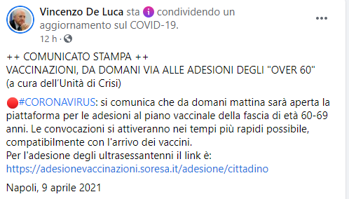 E' aperta da stamane la piattaforma riservata agli over 60 per le adesione al piano vaccinale. Questo il comunicato stampa pubblicato ieri sera sulla sua pagina Facebook dal Presidente della Regione Campania Vincenzo De Luca: "Vaccinazioni, da domani via alle adesioni degli 'over 60' (a cura dell'unità di Crisi). Coronavirus: si comunica - si legge nel post - che da domani mattina sarà aperta la piattaforma per le adesioni al piano vaccinale della fascia di età 60-69 anni. Le convocazioni si attiveranno nei tempi più rapidi possibile, compatibilmente con l'arrivo dei vaccini.