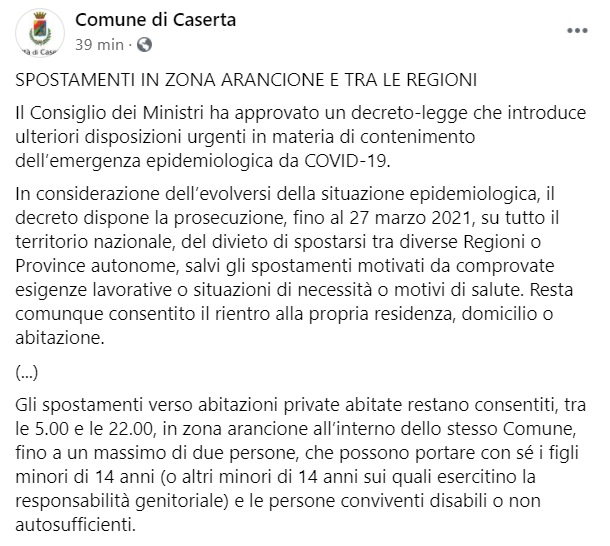 "Il Consiglio dei Ministri ha approvato un decreto-legge che introduce ulteriori disposizioni urgenti in materia di contenimento dell’emergenza epidemiologica da COVID-19. In considerazione dell’evolversi della situazione epidemiologica, il decreto dispone la prosecuzione, fino al 27 marzo 2021, su tutto il territorio nazionale, -si legge nella nota- del divieto di spostarsi tra diverse Regioni o Province autonome, salvi gli spostamenti motivati da comprovate esigenze lavorative o situazioni di necessità o motivi di salute. Resta comunque consentito il rientro alla propria residenza, domicilio o abitazione. (...) -Si legge nella nota- Gli spostamenti verso abitazioni private abitate restano consentiti, tra le 5.00 e le 22.00, in zona arancione all’interno dello stesso Comune, fino a un massimo di due persone, che possono portare con sé i figli minori di 14 anni (o altri minori di 14 anni sui quali esercitino la responsabilità genitoriale) e le persone conviventi disabili o non autosufficienti."