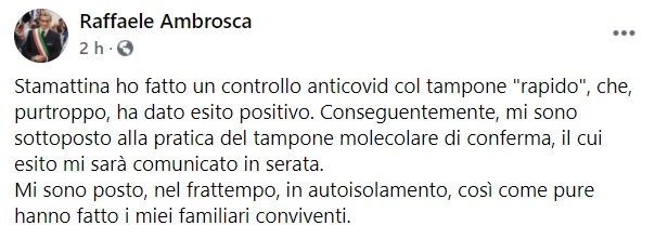 Questo quanto apprendiamo dalla pagina fb del Sindaco di Cancello e Arnone: "Stamattina ho fatto un controllo anticovid col tampone "rapido", che, purtroppo, ha dato esito positivo. Conseguentemente, mi sono sottoposto alla pratica del tampone molecolare di conferma - si legge nella nota -, il cui esito mi sarà comunicato in serata. Mi sono posto, nel frattempo, in autoisolamento, così come pure hanno fatto i miei familiari conviventi."