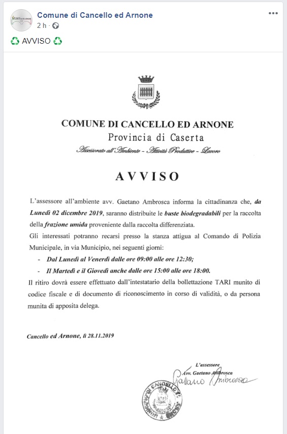 Questo quanto apprendiamo dalla Pgaina FB del Comune di Cancello ed Arnone