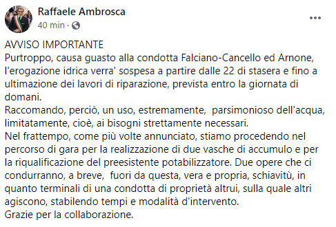 Questo il post pubblicato sulla sua pagina Facebook dal Sindaco di Cancello ed Arnone Raffaele Ambrosca: "Avviso importante. Purtroppo, causa guasto alla condotta Falciano-Cancello ed Arnone, l'erogazione idrica verra' sospesa a partire dalle 22 di stasera e fino a ultimazione dei lavori di riparazione, prevista entro la giornata di domani. Raccomando - prosegue il post - perciò, un uso, estremamente, parsimonioso dell'acqua, limitatamente, cioè, ai bisogni strettamente necessari. Nel frattempo, come più volte annunciato, stiamo procedendo nel percorso di gara per la realizzazione di due vasche di accumulo - prosegue il post - e per la riqualificazione del preesistente potabilizzatore. Due opere che ci condurranno, a breve, fuori da questa, vera e propria, schiavitù, in quanto terminali di una condotta di proprietà altrui, sulla quale altri agiscono, stabilendo tempi e modalità d'intervento. Grazie - conclude il post - per la collaborazione".