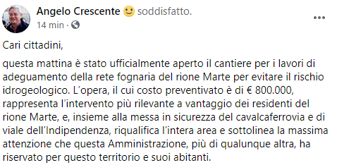 Questo parte del post pubblicato sulla sua pagina Facebook dal Sindaco di Capodrise Angelo Crescente: "Cari cittadini, questa mattina è stato ufficialmente aperto il cantiere per i lavori di adeguamento della rete fognaria del rione Marte per evitare il rischio idrogeologico. L’opera, il cui costo preventivato è di € 800.000 - si legge - rappresenta l’intervento più rilevante a vantaggio dei residenti del rione Marte, e, insieme alla messa in sicurezza del cavalcaferrovia e di viale dell’Indipendenza, riqualifica l’intera area e sottolinea la massima attenzione che questa Amministrazione, più di qualunque altra, ha riservato - prosegue il post - per questo territorio e suoi abitanti (...)".