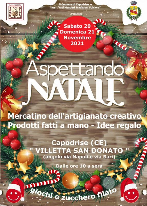 Nelle giornate di sabato 20 e domenica 21 novembre a partire dalle 10 si terrà, presso la villetta San Donato a Capodrise, l'evento 'Aspettando il Natale', il mercatino dell'artigianato creativo con prodotti fatti a mano ed idee regalo.