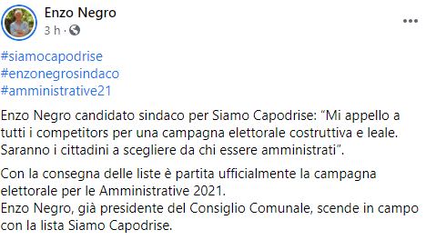 Questo il comunicato stampa diffuso dal candidato Sindaco di Capodrise Enzo Negro: "Enzo Negro candidato sindaco per Siamo Capodrise: “Mi appello a tutti i competitors per una campagna elettorale costruttiva e leale. Saranno i cittadini a scegliere da chi essere amministrati”. Con la consegna delle liste è partita ufficialmente - si legge nel comunicato - la campagna elettorale per le Amministrative 2021. Enzo Negro, già presidente del Consiglio Comunale, scende in campo con la lista Siamo Capodrise. Questi i candidati che l’accompagneranno per la conquista della fascia Tricolore: