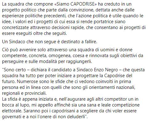 La squadra che compone «Siamo CAPODRISE» ha creduto - si legge ancora - in un progetto politico che parte dalla convinzione, dettata anche dalle esperienze politiche precedenti, che l’azione politica è utile quando le idee, i valori ed i progetti di cui essa si rende portatrice siano concretizzate attraverso decisioni rapide, che consentano ai progetti di essere eseguiti oltre che seguiti.
