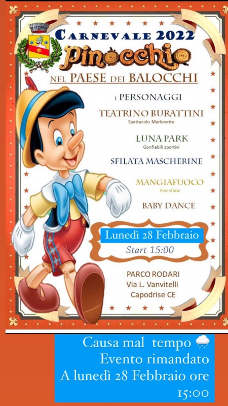 Questo il post pubblicato sulla pagina Facebook 'Vincenzo Negro Sindaco - Siamo Capodrise': "Purtroppo le condizioni meteo avverse ci hanno visto costretti - si legge nel post - a posticipare l’evento “Pinocchio nel Paese dei Balocchi a lunedì 28 Febbraio alle 15. Non mancate".