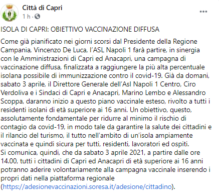 Questo il post pubblicato sulla pagina Facebook Città di Capri: "Isola di Capri: obiettivo vaccinazione diffusa. Come già pianificato nei giorni scorsi dal Presidente della Regione Campania, Vincenzo De Luca, l’ASL Napoli 1 farà partire, in sinergia con le Amministrazioni di Capri ed Anacapri, una campagna di vaccinazione diffusa, finalizzata - si legge nel post - a raggiungere la più alta percentuale isolana possibile di immunizzazione contro il covid-19. Già da domani, sabato 3 aprile, il Direttore Generale dell’Asl Napoli 1 Centro, Ciro Verdoliva e i Sindaci di Capri e Anacapri, Marino Lembo e Alessandro Scoppa, daranno inizio a questo piano vaccinale esteso, rivolto a tutti i residenti isolani di età superiore ai 16 anni. Un obiettivo, questo - proseguue il post - assolutamente fondamentale per ridurre al minimo il rischio di contagio da covid-19, in modo tale da garantire la salute dei cittadini e il rilancio del turismo, il tutto nell’ambito di un’isola ampiamente vaccinata e quindi sicura per tutti, residenti, lavoratori ed ospiti. Si comunica, quindi - si legge ancora nel post - che da sabato 3 aprile 2021, a partire dalle ore 14.00, tutti i cittadini di Capri ed Anacapri di età superiore ai 16 anni potranno aderire volontariamente alla campagna vaccinale inserendo i propri dati nella piattaforma regionale