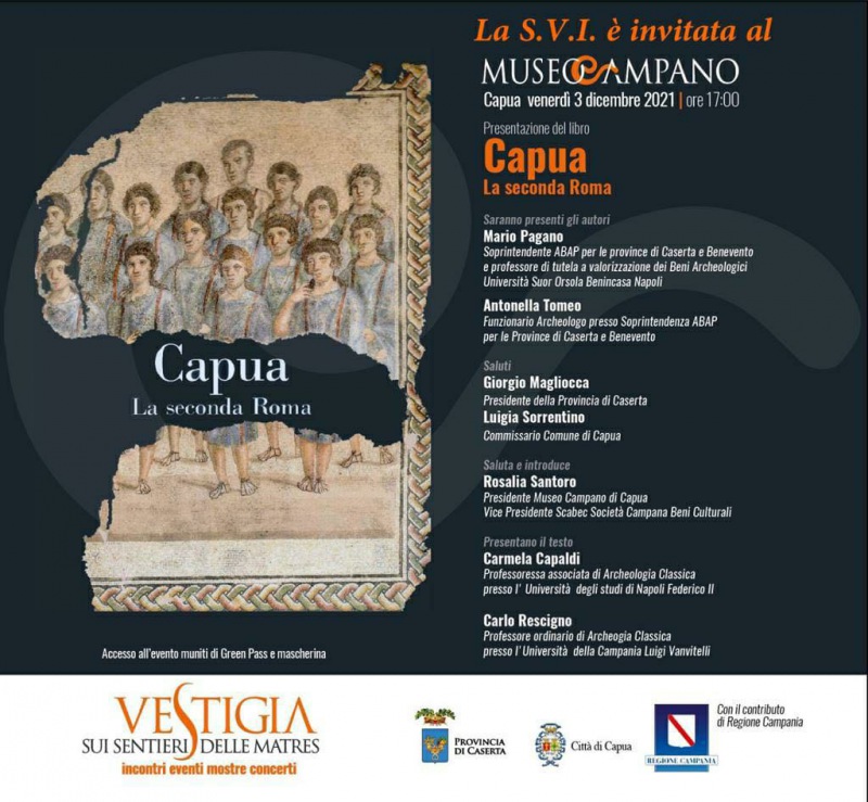 Venerdì 3 dicembre alle ore 17 presso il Museo Campano di Capua vi sarà la presentazione del libro 'Capua La seconda Roma'. Saranno presenti gli autori Antonella Tomeo e Mario Pagano, introdurrà Rosalia Santoro, Presidente del Museo Campano e Vice Presidente Scabec, porteranno i saluti istituzioni Giorgio Magliocca, Presidente della Provincia di Caserta, e Luigia Sorrentino, Commissario del Comune di Capua, e discuteranno del volume i professori di Archeologia Classica Carmela Capaldi, dell'Università di Napoli Federico II, e Carlo Rescigno, dell'Università della Campania Luigi Vanvitelli.