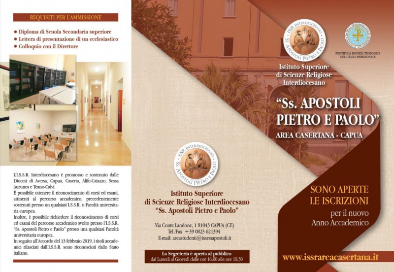 Sono aperte le iscrizioni per il nuovo Anno Accademico presso l'Istituto Superiore di Scienze Religiose Interdiocesano "Ss. Apostoli Pietro e Paolo" di Capua. I requisiti per l'ammissione sono: diploma di Scuola Secondaria superiore, lettera di presentazione di un ecclesiastico e colloquio con il Direttore.
