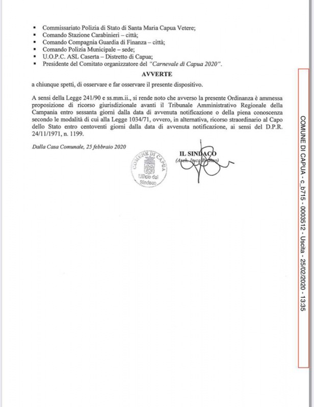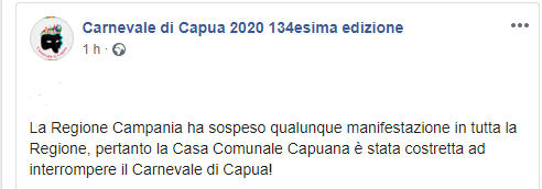 "...La Regione Campania ha sospeso qualunque manifestazione in tutta la Regione, pertanto la Casa Comunale Capuana è stata costretta ad interrompere il Carnevale di Capua!"