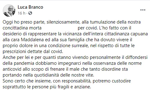 Questo il post pubblicato dal Sindaco di Capua Luca Branco sulla sua pagina Facebook