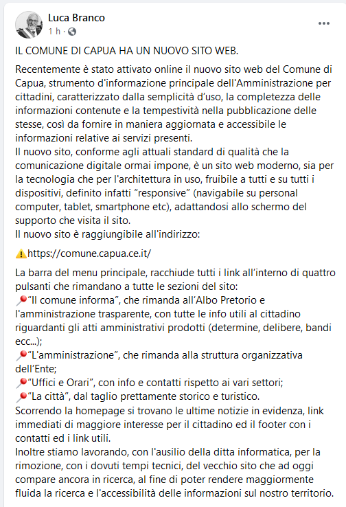 Questo il post pubblicato dal sindaco di Capua, Luca Branco, sulla sua pagina Facebook: "Recentemente è stato attivato online il nuovo sito web del Comune di Capua, strumento d'informazione principale dell'Amministrazione per cittadini, caratterizzato dalla semplicità d’uso, la completezza delle informazioni contenute e la tempestività nella pubblicazione delle stesse, così da fornire in maniera aggiornata e accessibile le informazioni relative ai servizi presenti. Il nuovo sito - si legge - conforme agli attuali standard di qualità che la comunicazione digitale ormai impone, è un sito web moderno, sia per la tecnologia che per l'architettura in uso, fruibile a tutti e su tutti i dispositivi, definito infatti “responsive” (navigabile su personal computer, tablet, smartphone etc), adattandosi allo schermo del supporto che visita il sito. Il nuovo sito è raggiungibile all'indirizzo: CLICCA QUI La barra del menu principale -ancora - racchiude tutti i link all’interno di quattro pulsanti che rimandano a tutte le sezioni del sito: “Il comune informa”, che rimanda all’Albo Pretorio e l'amministrazione trasparente, con tutte le info utili al cittadino riguardanti gli atti amministrativi prodotti (determine, delibere, bandi ecc...); “L'amministrazione”, che rimanda alla struttura organizzativa dell’Ente;“Uffici e Orari”, con info e contatti rispetto - recita il post - ai vari settori; “La città”, dal taglio prettamente storico e turistico. Scorrendo la homepage si trovano le ultime notizie in evidenza, link immediati di maggiore interesse per il cittadino ed il footer con i contatti ed i link utili. Inoltre stiamo lavorando - conclude il post - con l'ausilio della ditta informatica, per la rimozione, con i dovuti tempi tecnici, del vecchio sito che ad oggi compare ancora in ricerca, al fine di poter rendere maggiormente fluida la ricerca e l'accessibilità delle informazioni sul nostro territorio".