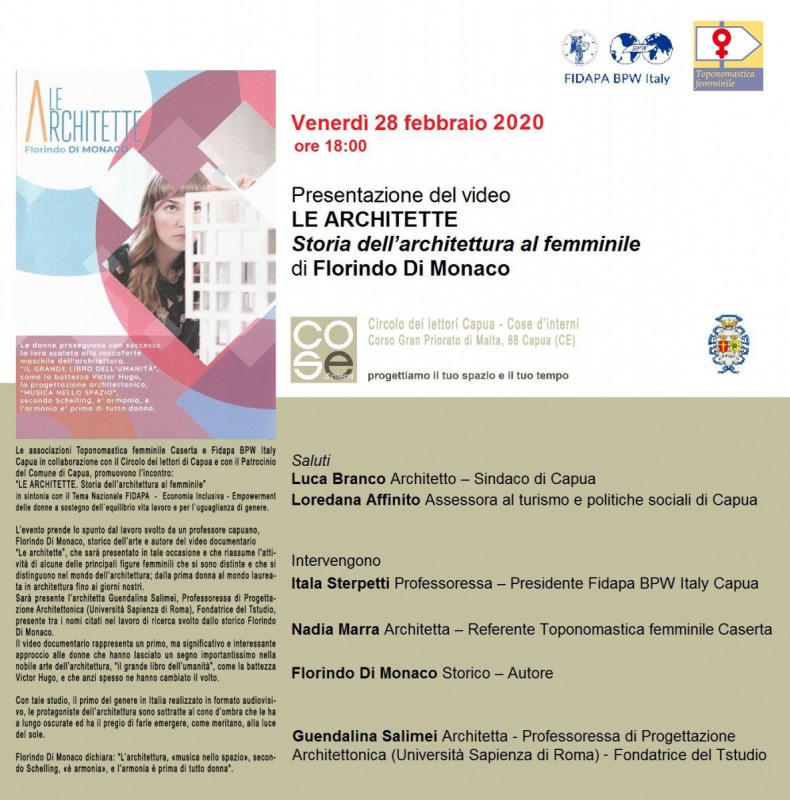 "Le associazioni Toponomastica femminile Caserta e Fidapa BPW Italy Capua in collaborazione con il Circolo dei lettori di Capua e con il Patrocinio del Comune di Capua, promuovono l’incontro: “Le architette. Storia dell’architettura al femminile”, che si svolgerà venerdì 28 febbraio 2020 alle ore 18:00 al Circolo dei lettori di Capua, Corso Gran Priorato di Malta n. 88, Capua. -Si legge nella nota- L’argomento trattato è in sintonia con il Tema Nazionale FIDAPA - Economia Inclusiva “Empowerment delle donne a sostegno dell`equilibrio vita lavoro e per l`uguaglianza di genere”. L’evento prende lo spunto dal lavoro svolto da un professore capuano, Florindo Di Monaco, storico dell’arte e autore del video documentario “Le architette”, che sarà presentato in tale occasione e che riassume l'attività di alcune delle principali figure femminili che si sono distinte e che si distinguono nel mondo dell’architettura; dalla prima donna al mondo laureata in architettura fino ai giorni nostri. -Si legge nella nota- Sarà presente l’architetta Guendalina Salimei, Professoressa di Progettazione Architettonica (Università Sapienza di Roma), Fondatrice del Tstudio, presente tra i nomi citati nel lavoro di ricerca svolto dallo storico Florindo Di Monaco. Alla figura della Salimei si riferisce la protagonista femminile (interpretata da Paola Cortellesi) del film “Scusate se esisto!” di Riccardo Milani. Il film è ispirato dal progetto dell'architetta per la riqualificazione del Corviale (complesso residenziale della periferia di Roma) dove per una donna, nonostante la sua qualifica, ottenere un lavoro all'altezza si rivela tuttavia difficile, fino al momento in cui decide di farsi passare per uomo. Il video documentario rappresenta un primo, ma significativo e interessante approccio alle donne che hanno lasciato un segno importantissimo nella nobile arte dell’architettura, “il grande libro dell’umanità”, come la battezza Victor Hugo, e che anzi spesso ne hanno cambiato il volto. -Si legge nella nota- Con tale studio, il primo del genere in Italia realizzato in formato audiovisivo, le protagoniste dell’architettura sono sottratte al cono d’ombra che le ha a lungo oscurate ed ha il pregio di farle emergere, come meritano, alla luce del sole. Florindo Di Monaco dichiara: “L’architettura, «musica nello spazio», secondo Schelling, «è armonia», e l’armonia è prima di tutto donna".