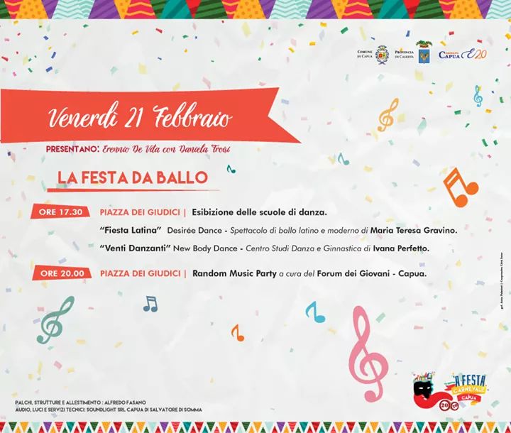 Oggi, venerdì 21 febbraio, a Capua, si terrà l'evento 'La festa da ballo' con tanti spettacoli di danza per preparare il Carnevale. Gli spettacoli prenderanno inizio a partire dalle ore 17:30.