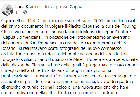 Questo il post pubblicato dal Sindaco di Capua Luca Branco sulla sua pagina Facebook: "Oggi, nella città di Capua, mentre si celebrano i 1061 anni dalla nascita del primo documento in volgare il Placito Capuano, a cura del Touring Club e viene presentato il nuovo lavoro di Mons. Giuseppe Centore "Capua Domenicana", in occasione - si legge nel post - dell'ottocentesimo anniversario della morte di San Domenico, a cura dell'Arciconfraternita del SS. Rosario, si realizzavano scatti fotografici del nuovo complesso architettonico posto a ridosso del ponte ad opera dell'architetto e fotografo siciliano Santo Eduardo de Miceli. L'opera - prosegue il post - è stata selezionata dalla rivista the Plan sulla base della qualità progettuale per raccontare il meglio dell'architettura italiana di oggi in una prossima pubblicazione. La nostra città dalla storia bimillenaria racconta quanto accaduto - si legge ancora nel post - in passato e con uno spirito di amicizia, lavoro di squadra e di crescita culturale, segna il solco di una nuova stagione che ha a cuore il ridisegno della città, frutto di un continuo confronto".
