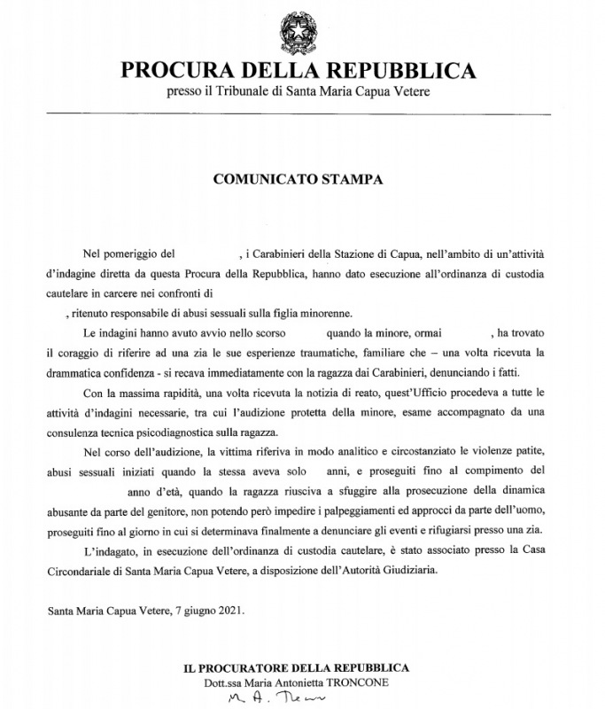 Questa parte della nota stampa della Procura di SMCV: