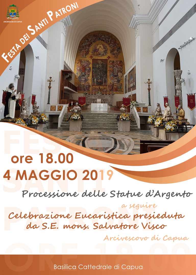 Sabato 4 maggio 2019 alle ore 18.00, come da tradizione, ci sarà la processione delle statue d’argento in onore dei Santi Patroni di Capua.