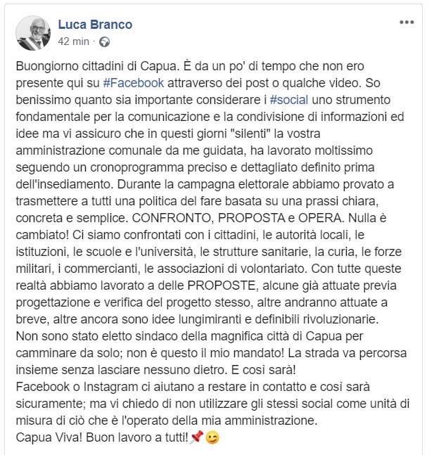 Questo quanto il Sindaco Branco ha comunicato via social
