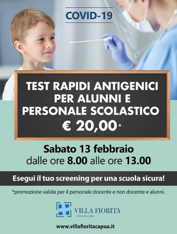 La Casa di Cura ha riservato la promozione ai docenti, agli alunni e al personale delle scuole dell’obbligo. Tamponi rapidi antigenici a 20 euro per il personale docente e non docente e per gli alunni delle scuole dell’obbligo. A promuovere l’iniziativa per una scuola sicura - si legge nella nota -, è la Casa di Cura “Villa Fiorita” di Capua che, per la sola giornata di domani sabato 13 febbraio, dalle ore 8.00 alle ore 13.00, effettuerà test rapidi antigenici per la rilevazione dell’infezione da Covid-19 a prezzo agevolato. Presso il laboratorio dedicato della clinica, i docenti, gli alunni ed il personale scolastico tutto delle scuole dell'infanzia, primarie e secondarie, potranno sottoporsi al tampone naso-faringeo - si legge nella nota - ad un costo ridotto di 20 euro, con il risultato che sarà fornito entro 15 minuti. “La nostra Casa di Cura intende così dare il proprio contributo al necessario screening per rendere più sicura la scuola e tutelare chi la frequenta in questa fase di emergenza sanitaria, tanto che contiamo di ripetere periodicamente la promozione in favore sempre del personale scolastico”, dichiara Raffaella Sibillo - si legge nella nota -, presidente del CdA di Villa Fiorita."