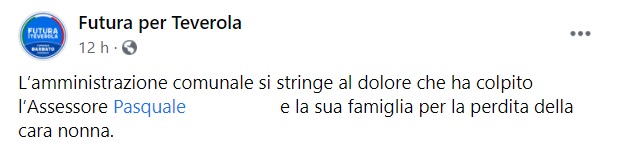 "L’amministrazione comunale si stringe al dolore che ha colpito l’Assessore Pasquale ... e la sua famiglia per la perdita della cara nonna."
