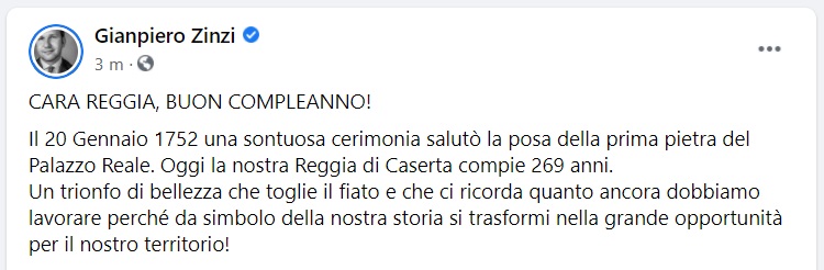 Questo quanto pubblicato sulla pagina fb del Cons. Reg. Zinzi: "CARA REGGIA, BUON COMPLEANNO! Il 20 Gennaio 1752 una sontuosa cerimonia - si legge nella nota - salutò la posa della prima pietra del Palazzo Reale. Oggi la nostra Reggia di Caserta compie 269 anni. Un trionfo di bellezza che toglie il fiato e che ci ricorda - si legge nella nota - quanto ancora dobbiamo lavorare perché da simbolo della nostra storia si trasformi nella grande opportunità per il nostro territorio!"