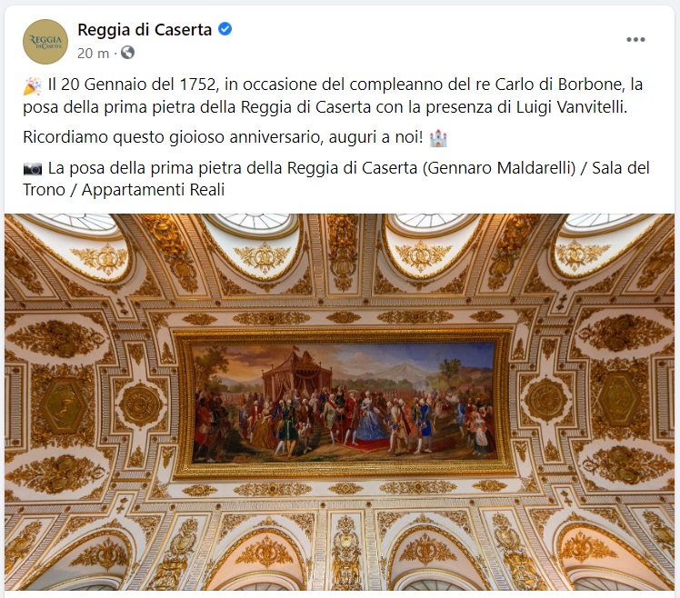 Questo quanto pubblicato sulla pagina fb della Reggia di Caserta: "Il 20 Gennaio del 1752, in occasione del compleanno del re Carlo di Borbone - si legge nella nota -, la posa della prima pietra della Reggia di Caserta con la presenza di Luigi Vanvitelli. Ricordiamo questo gioioso anniversario, auguri a noi! FOTO La posa della prima pietra della Reggia di Caserta (Gennaro Maldarelli) / Sala del Trono - si legge nella nota - / Appartamenti Reali"