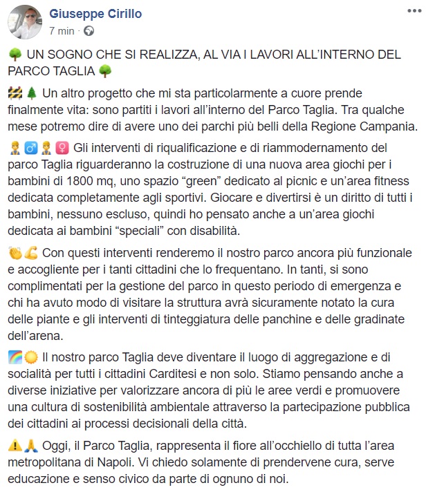 Questo quanto apprendiamo dalla pagina facebook del Sindaco Cirillo: