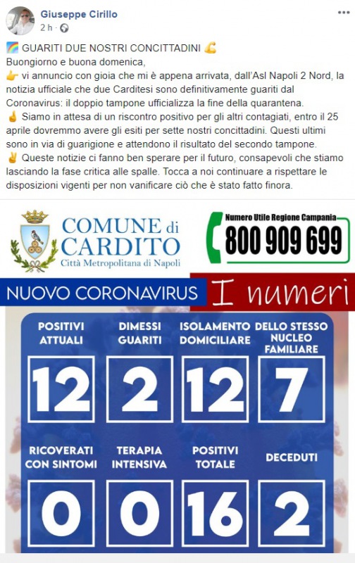 Questo quanto apprendiamo dalla pagina facebook del Sindaco Cirillo: