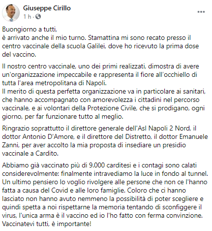 Questo il post pubblicato sulla sua pagina Facebook dal Sindaco di Cardito Giuseppe Cirillo: "Buongiorno a tutti, è arrivato anche il mio turno. Stamattina mi sono recato presso il centro vaccinale della scuola Galilei, dove ho ricevuto la prima dose del vaccino. Il nostro centro vaccinale, uno dei primi realizzati, dimostra di avere un'organizzazione impeccabile e rappresenta il fiore all’occhiello di tutta l'area metropolitana di Napoli. Il merito - si legge nel post - di questa perfetta organizzazione va in particolare ai sanitari, che hanno accompagnato con amorevolezza i cittadini nel percorso vaccinale, e ai volontari della Protezione Civile, che si prodigano, ogni giorno, per far funzionare tutto al meglio. Ringrazio soprattutto il direttore generale dell'Asl Napoli 2 Nord, il dottor Antonio D'Amore, e il direttore del Distretto, il dottor Emanuele Zanni, per aver accolto la mia proposta di insediare un presidio vaccinale a Cardito. Abbiamo già vaccinato più di 9.000 carditesi e i contagi - prosegue il post - sono calati considerevolmente: finalmente intravediamo la luce in fondo al tunnel. Un ultimo pensiero lo voglio rivolgere alle persone che non ce l'hanno fatta a causa del Covid e alle loro famiglie. Coloro che ci hanno lasciato non hanno avuto nemmeno la possibilità di poter scegliere e quindi spetta a noi rispettarne la memoria tentando di sconfiggere il virus, l'unica arma è il vaccino ed io l'ho fatto - conclude il post - con ferma convinzione. Vaccinatevi tutti, è importante!".
