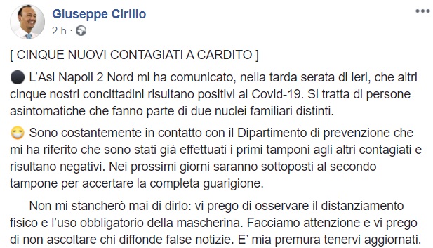 Questo quanto apprendiamo dalla pagina facebook del Sindaco Cirillo: