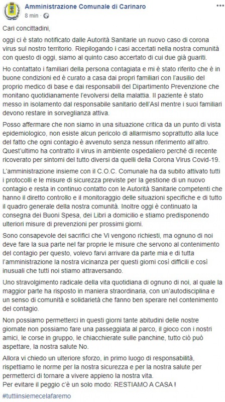 Questo quanto apprendiamo dalla pagina facebook del Comune di Carinaro: