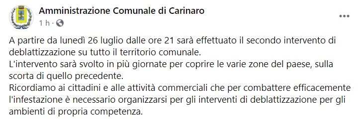 "A partire da lunedì 26 luglio dalle ore 21 sarà effettuato il secondo intervento di deblattizzazione su tutto il territorio comunale. L'intervento sarà svolto in più giornate per coprire le varie zone del paese, sulla scorta di quello precedente. -Si legge nella nota- Ricordiamo ai cittadini e alle attività commerciali che per combattere efficacemente l'infestazione è necessario organizzarsi per gli interventi di deblattizzazione per gli ambienti di propria competenza."