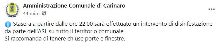 "Stasera a partire dalle ore 22:00 sarà effettuato un intervento di disinfestazione da parte dell'ASL su tutto il territorio comunale. Si raccomanda- si legge nella nota- di tenere chiuse porte e finestre."