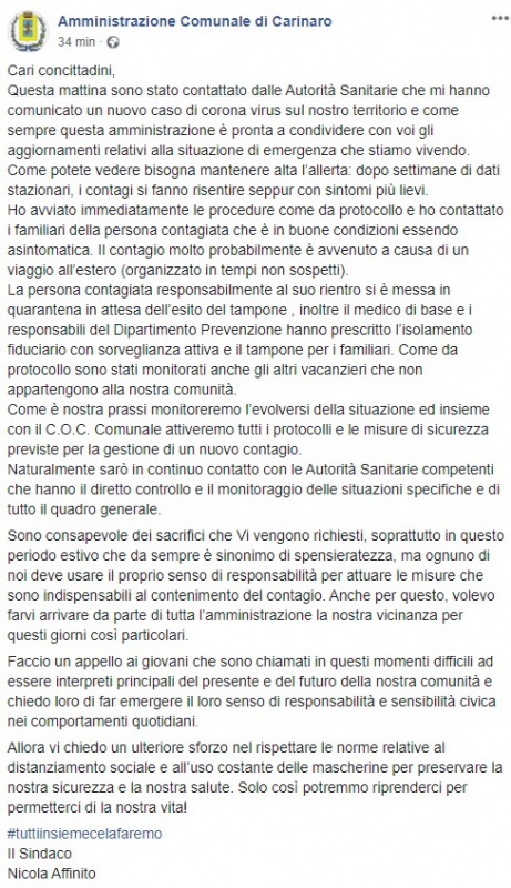 Questo quanto apprendiamo dalla pagina facebook del Comune di Carinaro: