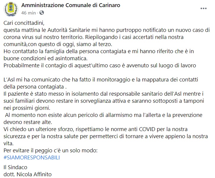 Questo parte di quanto apprendiamo dalla pagina facebook del Comune di Carinaro: