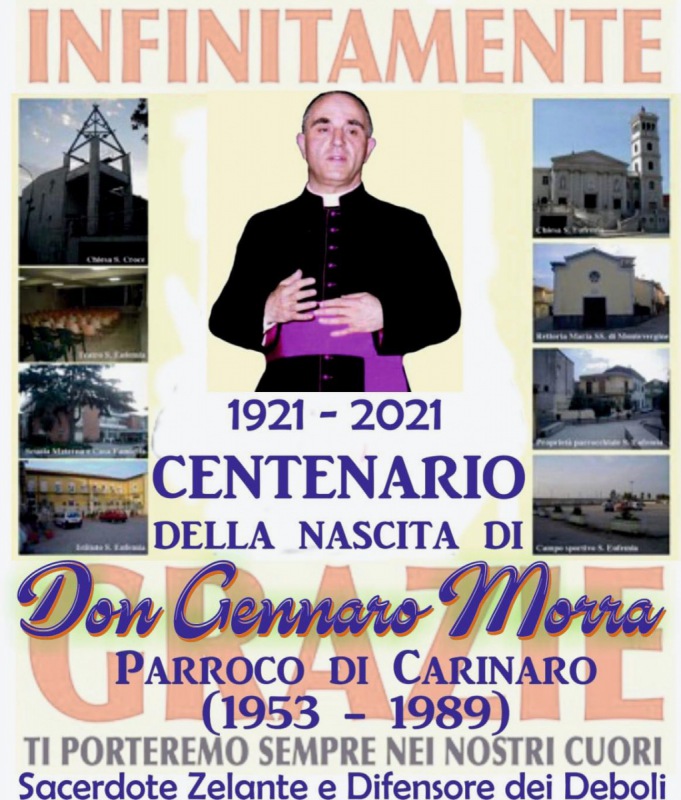 Sabato 22 febbraio 2020 alle ore 16.00 presso la sala conferenze della parrocchia S. Eufemia V. e M. di Carinaro nell’ambito delle celebrazioni per commemorare la figura del venerato parroco don Gennaro Morra in occasione del centenario della sua nascita, la comunità- si legge nella nota- lo ricorderà con un primo e singolare convegno dal tema: “Mons. Gennaro Morra un’intera vita sacerdotale spesa per la chiesa di Carinaro e per quella Aversana”. Sarà Don Antonio Lucariello Parroco di Carinaro ad introdurre i lavori, poi il dott. Giuseppe Barbato nelle vesti di vice presidente della Pro Loco “S. Eufemia” nonché per tanti anni fido collaboratore, condurrà e esporrà la vita, le opere e l’impegno sociale a Carinaro di don Gennaro Morra mentre relazionerà sull’operato di don Gennaro nella diocesi di Aversa Mons. Ernesto Rascato quale delegato regionale Beni Culturali Ecclesiastici Campania della diocesi di Aversa e parroco dell’Abbazia di San Lorenzo fuori le mura di Aversa. Mons. Gennaro Morra nasce a Frignano, l’1.1.1921, viene ordinato sacerdote l’11 luglio 1943, dal Vescovo Mons. Antonio Teutonico e gli viene affidata la parrocchia di S. Maria dell’Arco in Frignano dove vi rimane per 10 anni. L’11 ottobre del 1953- si legge nel comunicato- viene nominato Parroco della Parrocchia Sant’Eufemia di Carinaro dove vi rimane fino al 1989, per ben 36 anni. Nel 1976 Papa Paolo VI lo nomina monsignore. Vicario Episcopale per l’Edilizia Sacra, nominato dal Vescovo Mons. Antonio CECE sin dal 1979 ha collaborato con tutti i sacerdoti dell’interna diocesi per i problemi di edilizia sacra, suoi sono stati gli interessamenti per la ristrutturazione post- terremoto alla Cattedrale S. Paolo e Seminario Vescovile di Aversa su mandato dell’allora Vescovo Mons. Giovanni Gazza. Era laureato in Diritto Canonico presso la Pontificia Università di S. Tommaso a Roma e in Giurisprudenza presso l’Università degli Studi “Federico II” di Napoli. Era- si legge nella nota- Cavaliere della Repubblica Italiana e del S. Sepolcro. Era anche docente di discipline giuridiche. Sue sono le opere realizzate a Carinaro, quali l’Oratorio Parrocchiale, il Pensionato casa albergo per anziani” Sant’Eufemia”, il complesso sportivo “S. Eufemia”, la Scuola Materna con annessa Chiesa di S. Croce e Teatro, la ristrutturazione in toto della Chiesa Parrocchiale con quella di Montevergine rendendole dei veri gioielli d’arte. Ricordare e celebrare un anno intero, a cento anni dalla nascita, don Gennaro- si legge nel comunicato- è un orgoglio per tutti noi che abbiamo avuto il privilegio di conoscerlo, dichiara Barbato, e soprattutto abbiamo anche il dovere di trasmettere il suo operato alle nuove generazioni che non l’hanno conosciuto."