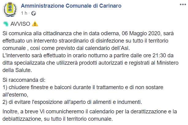 Questo quanto apprendiamo dalla pagina facebook del Comune di Carinaro: