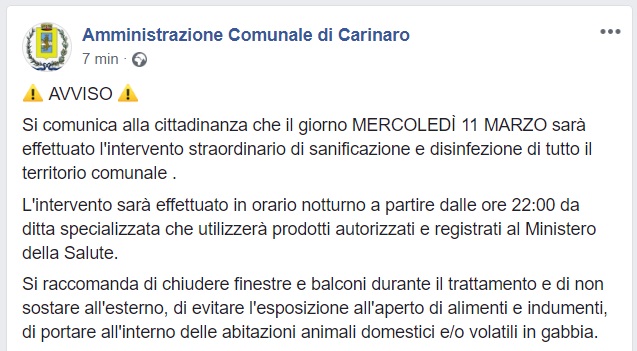 Questo quanto apprendiamo dalla pagina Facebook del Comune di Carinaro